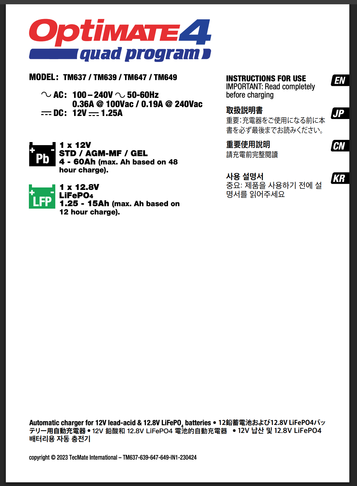 OptiMate 4 Quad Program(オプティメイト4 クワッド プログラム)は、世界で最も進化したパワースポーツバッテリーチャージャーです!